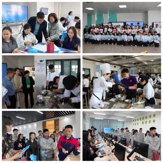 在实践教学环节,华侨大学留学生分为三组深入到工艺美术、面点制作、增材制造(3D打印)专业课堂。工艺美术课堂上,中外学子共同创作出传统剪纸作品,我校学生还为外国友人送上《哪吒》剪纸画;面点实训室里,留学生们在食品产教系林舒老师的指导下,将茶粉融入面团,制作出清香扑鼻的花式糕点曲奇;在机械产教系赖瑜莉老师、杨焜耀老师的技术支持下,3D打印工作坊则诞生了以中国传统文化电影《哪吒2》中的哪吒、敖丙为原型设计的文创印章摆件。课堂尾声,双方学生互换精心设计的“友力卡”——印有中外双语祝福的书签,成为跨文化交流的特别见证。