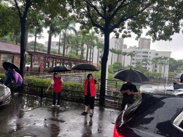 面对大雨给校园交通带来的压力,党员们冒雨奋战,在校门口及主干道等重要路口疏导车辆、指挥交通。他们引导车辆有序进出和停放,有效保障了校园道路的畅通与安全,为新生入学提供了有力的后勤保障。