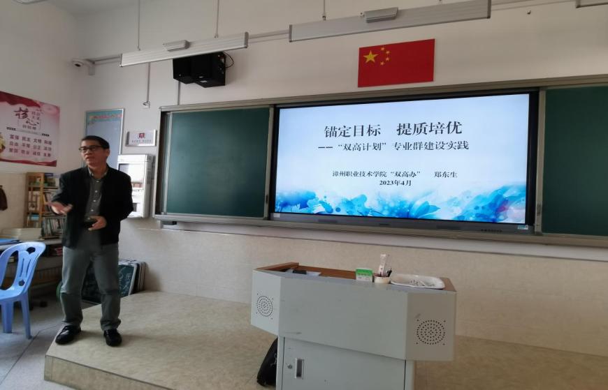 专业群内涵建设专项提升培训二班(面向制造类、自动化控制类专业群)由漳州职业技术学院双高办主任郑东生为大家开展《瞄定目标提质培优——“双高计划”专业群建设实践》讲座,郑东生教授从专业群建设的政策引导与产业驱动、专业群建设任务与高绩效项目培优、专业群绩效管理水平提质以及“双优计划”与专业群标志性成果创建四个方面展开论述,为我校双高专业群建设提供了思路及方向。