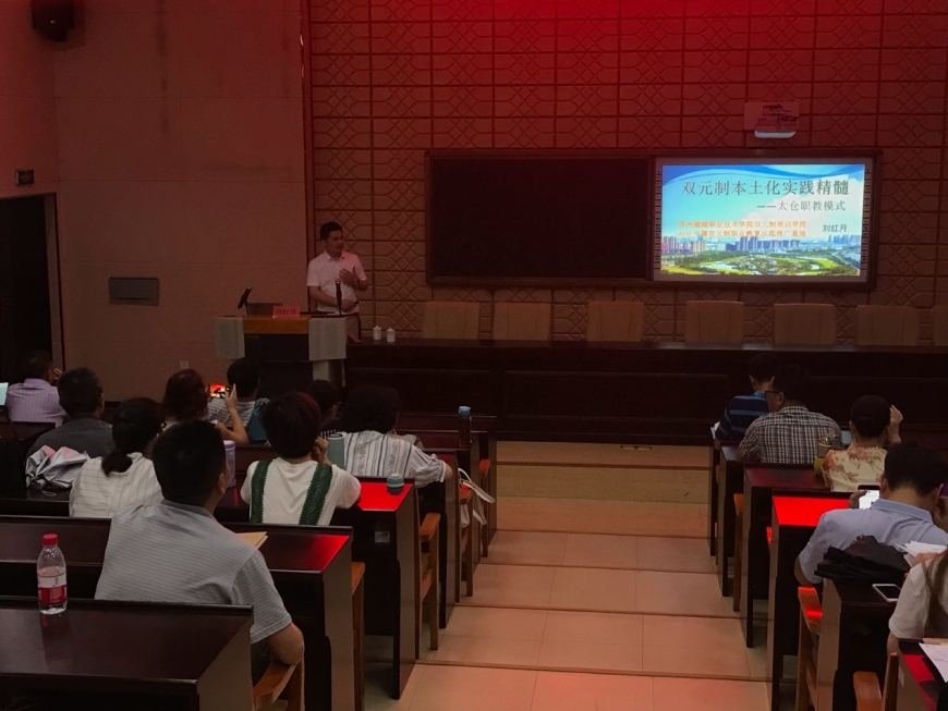 6月29日下午,我校2018年师资整体提升培训暨继续教育第四场培训,邀请了苏州健雄职业技术学院的刘红月院长来为我们讲授《双元制本土化时间精髓太仓职教模式》。刘院长首先与我们探讨了专业发展的关键因素即职业教育需要解决的问题;然后分享了他赴德国学习职业教育的切身体会,以及德国的跨文化、双元制教育法、行为导向教学法的精髓,他提出我们职业教育的教师应该转变传统的角色观念,要把学生当成学徒,当成同事来对待,来培养;最后他结合了中国职业教育的现状和太仓产业的背景向我们介绍了太仓职业教育模式、双元制实践方案、以及校企合作与推广等方面内容。重点介绍了太仓职业教育模式“学校-跨企业培训中心-企业”三站互动、分段交替、四六轮换人才培养模式。