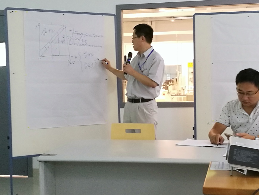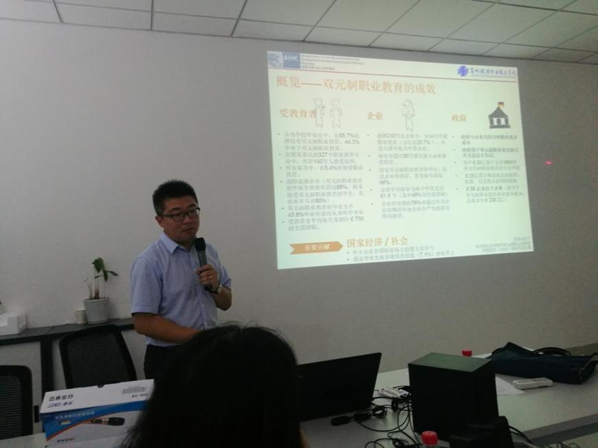 魏院长以“政行校企,四方联动产学研合作办学机制”为主题,从宏观的角度对德国双元制进行关键解读。魏院长指出当今的职业教育,企业和学校的合作力度不够,职业院校应该利用地方资源推动自身学校的特色发展,行业、企业是职业教育的推力,学校是职业教育的主阵地,进行多元化的职业教育,并以健雄学校为例讲解德国双元制的本土化实施。魏院长首先对太仓市进行介绍,让我们了解本地的资源及服务对象,并对学校的自身条件进行介绍,提出健雄学院的办学目的为服务地方经济,地方反馈学校,人才培养模式为三站互动,分段交替,四六轮换,德国双元制本土化实践的精髓为严谨的组织管理,保证职业教育的统一性和公平性,使得校企合作在稳定的环境下进行,培训记过的精益求精改进培训计划,吃寻做有意义的加法,是培训质量得到保证。