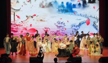 表演开始时,学生们向外宾们行礼作揖,通过“起势—凝驻—躬身”的舞蹈语言展现一职学子对外宾访漳的诚挚敬意。编钟金石之声乍起,学生们的水袖翩然化云,以“云歌袅袅”之姿勾勒待客之道。表演尾声,学生们褪去云绡雾縠,召来峨冠博带的“先秦士相”、泥金披帛的“唐代宫娥”、织金纻丝的“明代仕女”。