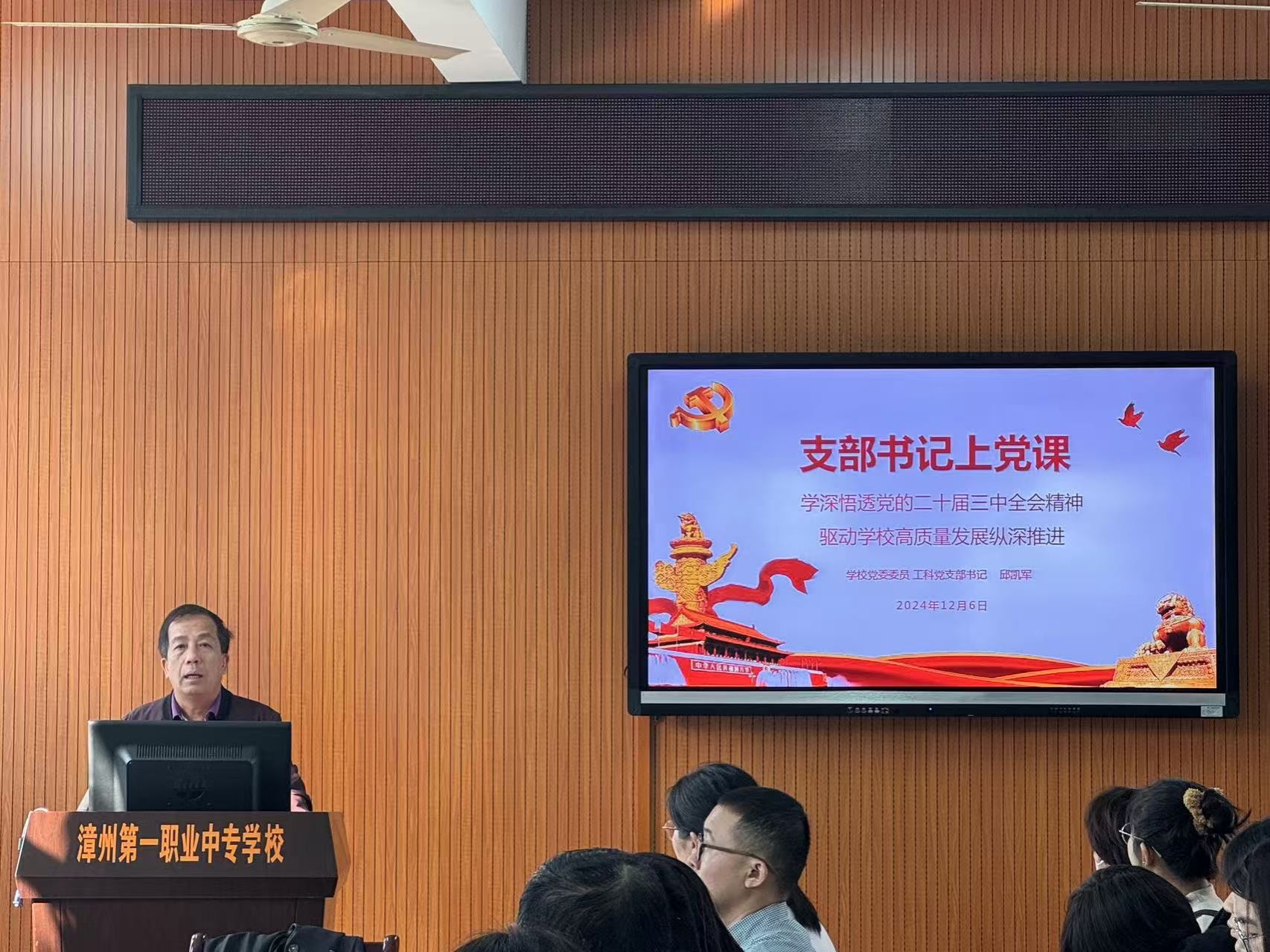 紧接着支部书邱凯军做题为《学深悟透党的二十届三中全会精神 驱动学校高质量发展纵深推进》的专题党课,在党课中邱凯军书记强调作为党员干部要始终坚持问题导向、找准问题、解决问题,深刻理解和实践新时代、新环境下全面深化改革要求,自觉担责尽责、善于作为,在学校教学教改中谱写发展新篇章、展现新作为。