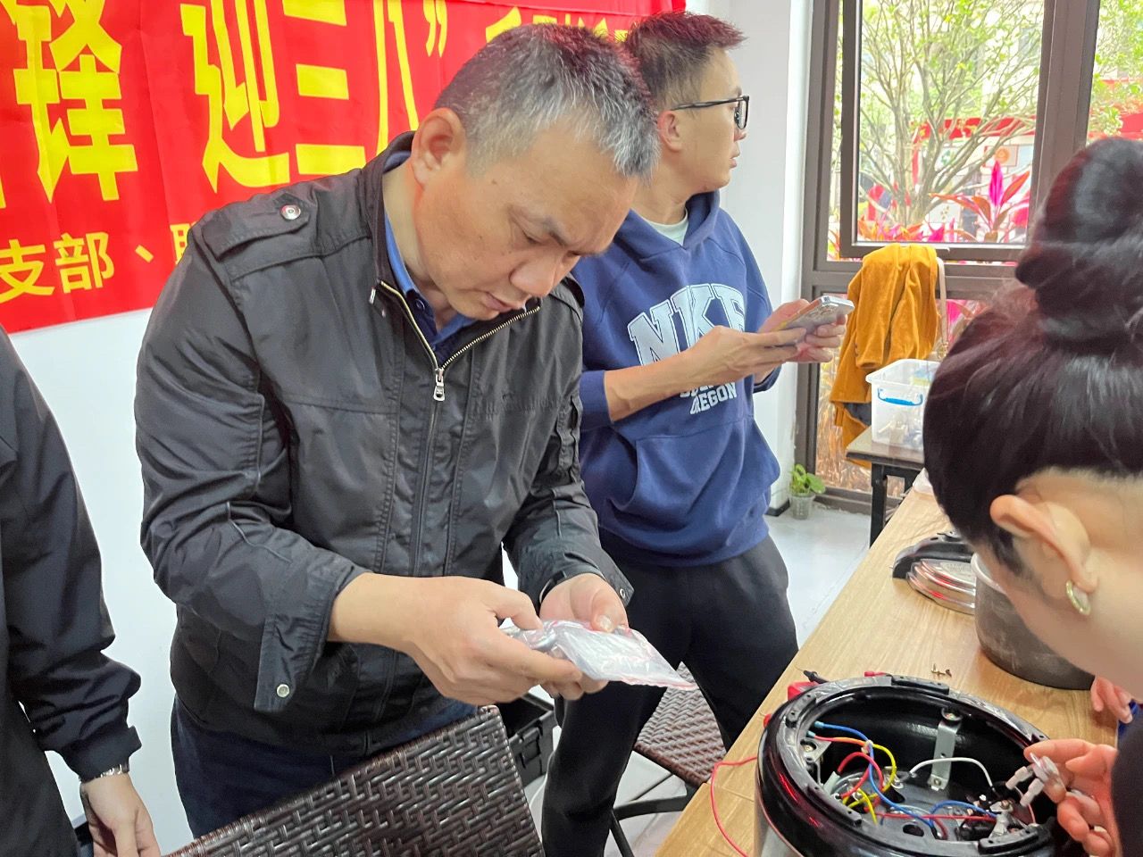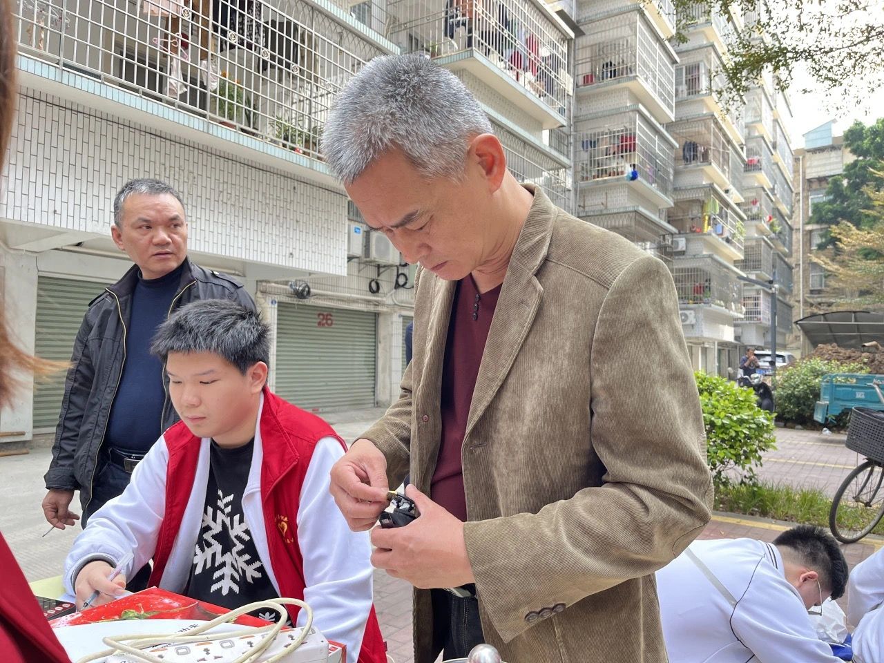 校园外,党员教师们早早抵达活动现场。大家齐心协力支起维修台后,居民们便陆续带着出现问题的饮水机、电饭煲、电烤箱等各类家用电器前来。每一件待修电器,都承载着居民对此次活动的期待。
