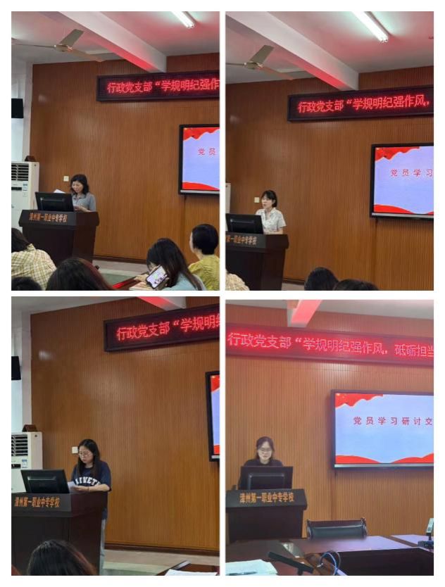 在随后的研讨交流环节,林丽芳、陈新、蔡宇慧、陈秋男四位党员代表结合各自岗位,围绕思政教育、心理服务、图书管理与教学育人,分享了自身在工作中践行中央八项规定精神,推动作风转变的体会与做法。
