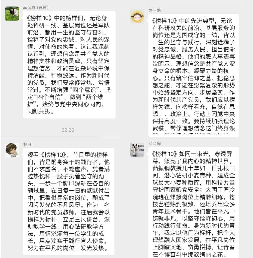 《榜样10》专题节目通过鲜活的镜头、生动的讲述,聚焦茹振钢、梁建英等优秀共产党员和先进基层党组织的感人事迹,他们中有扎根田野守护粮食安全的农业科技工作者,有深耕高铁领域攻克技术难关的科研先锋,有扎根基层服务群众的党员干部,在平凡岗位上书写了不平凡的人生华章。节目中,榜样们对理想信念的坚定坚守、对事业的无私奉献、对责任的勇敢担当,深深触动了每一位党员教师的心灵。