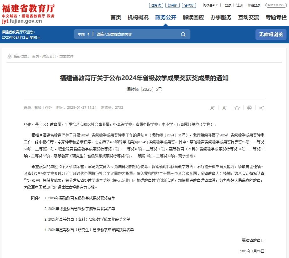 近日,福建省教育厅发布了《福建省教育厅关于公布2024年省级教学成果奖获奖成果的通知》(闽教师〔2025〕5号),由我校余佩芳副校长主持,连小铃、沈湖拱、赖瑜莉、邱梦林、陈瑞生、林舒、朱惠芬、王长福等共同完成的《双能夯基 数字垒台 校企共建 职普同筑——职教师资“屋式”培养模式的创新实践》项目荣获福建省职业教育教学成果奖特等奖。这是我校在福建省职业教育教学成果奖上取得的突破性成绩。