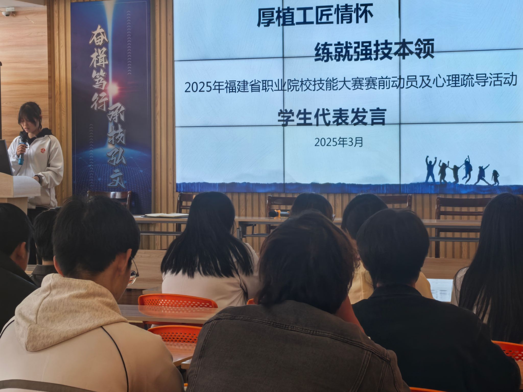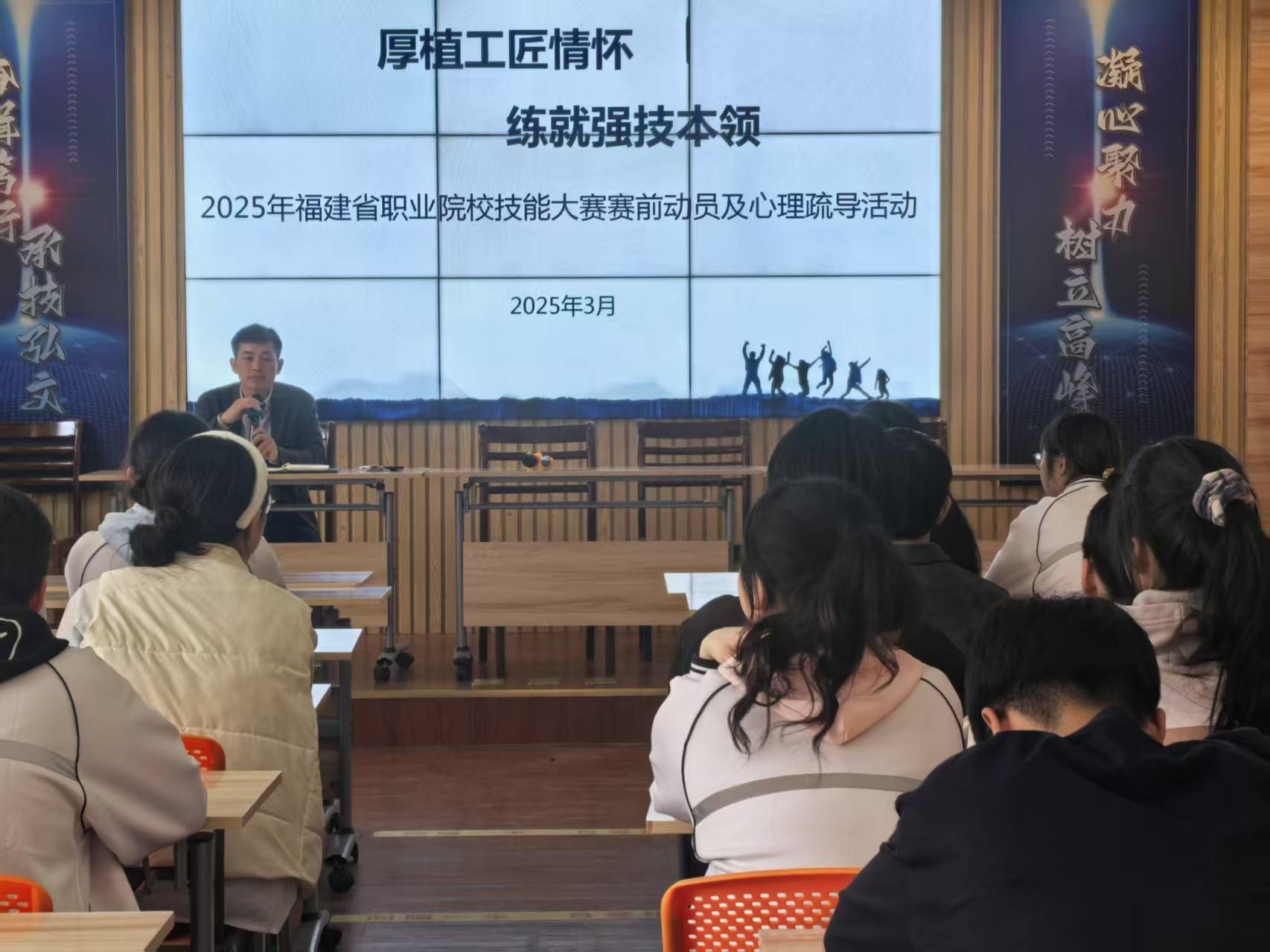 为更好地迎接2025年福建省职业技能大赛,加强我校备赛环节的管理,进一步激发参赛选手的斗志和舒缓备赛过程中的压力,确保参赛选手能以最佳状态迎接比赛。3月20日下午,我校召开2025年福建省职业院校技能大赛赛前动员及心理疏导活动。学校副校长、教务处主任沈湖拱,教务处副主任陈瑞生和34个赛项的参赛选手参加活动,此次活动由陈副主任主持。