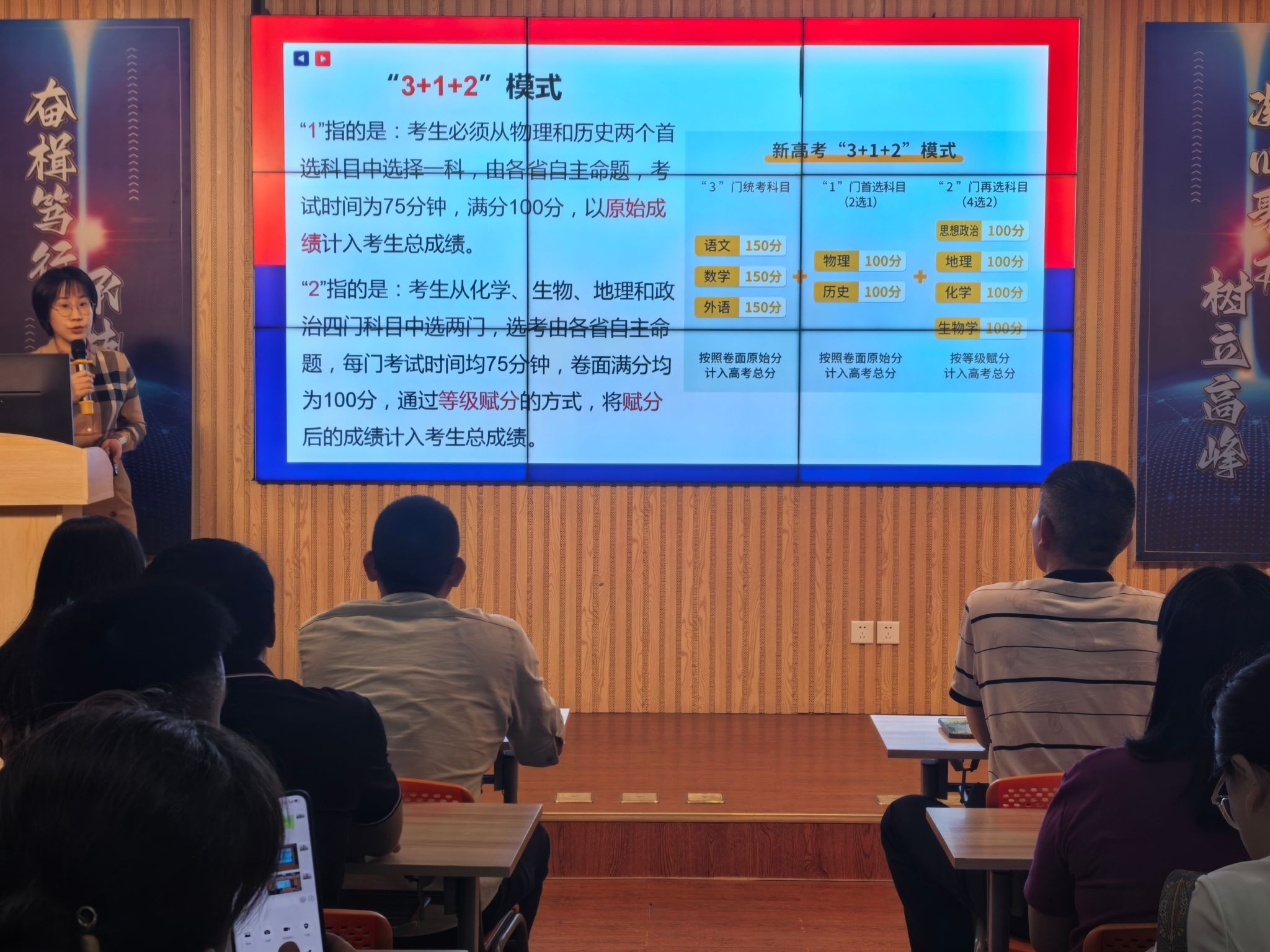 随后,综合高中部负责人连小铃老师就新高考政策改革进行详细解读,重点分析了”3+2+1”选科模式的考试要求、计分方式及高校专业选科限制,并结合近年来的录取数据,帮助家长理解不同学科组合的优劣势。