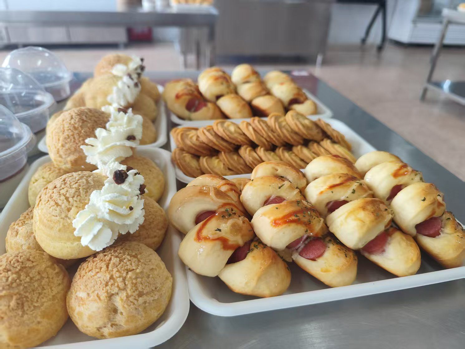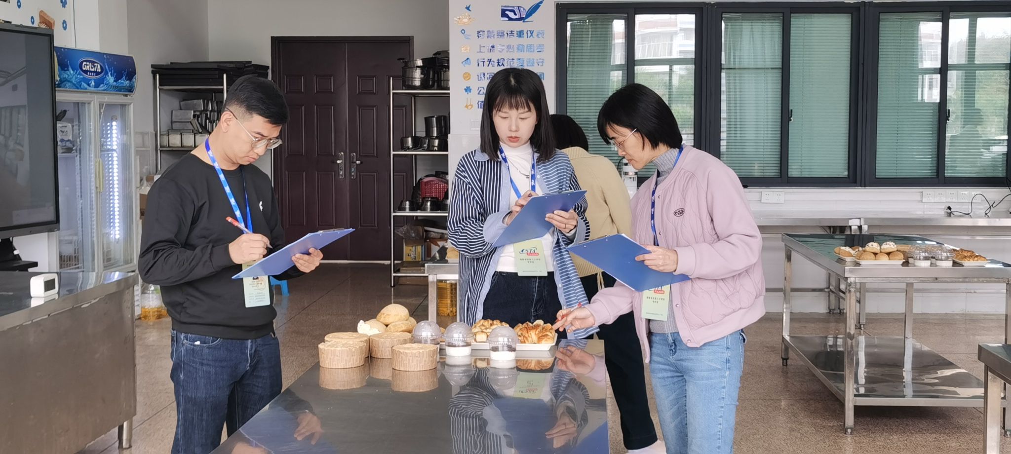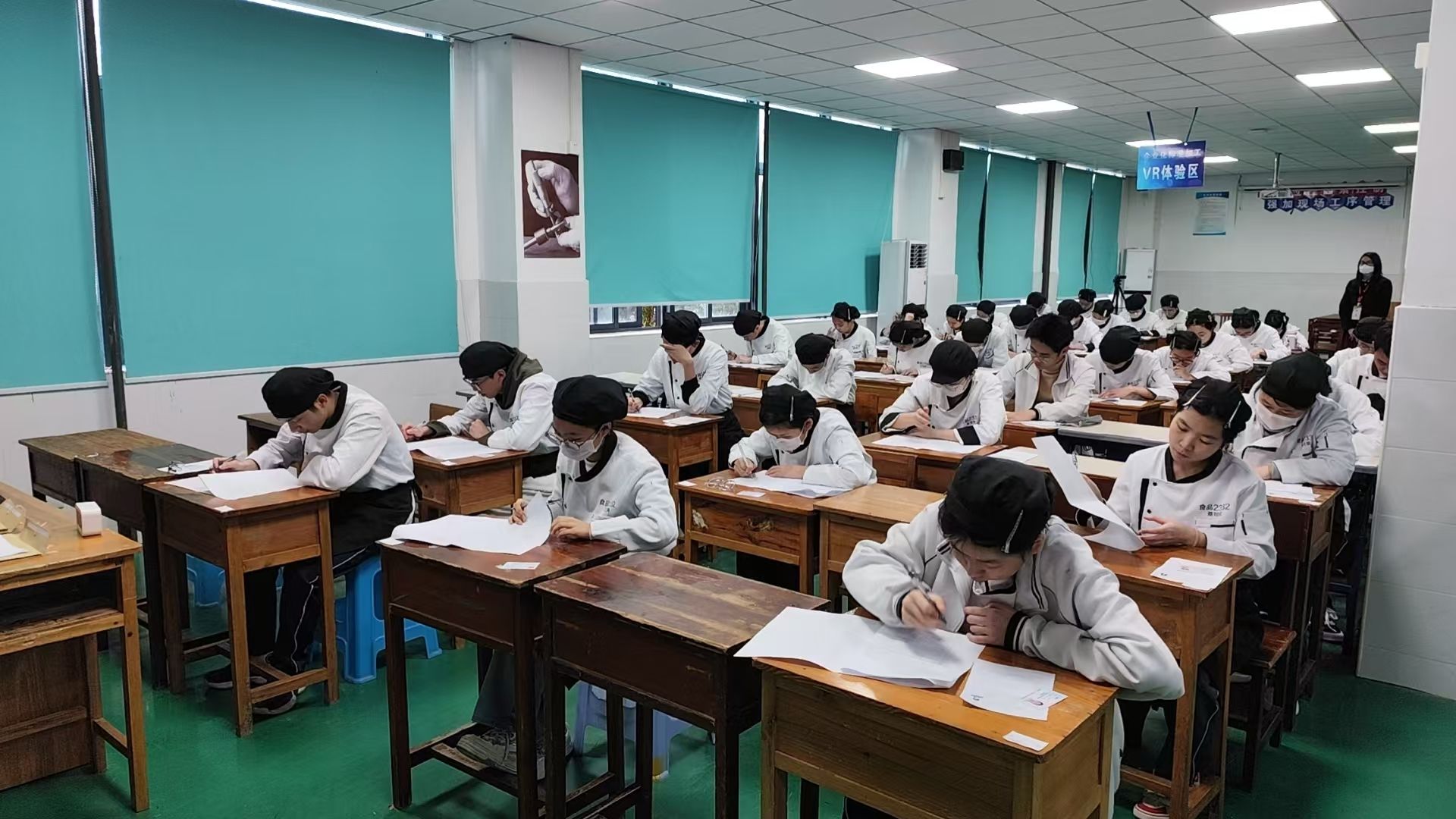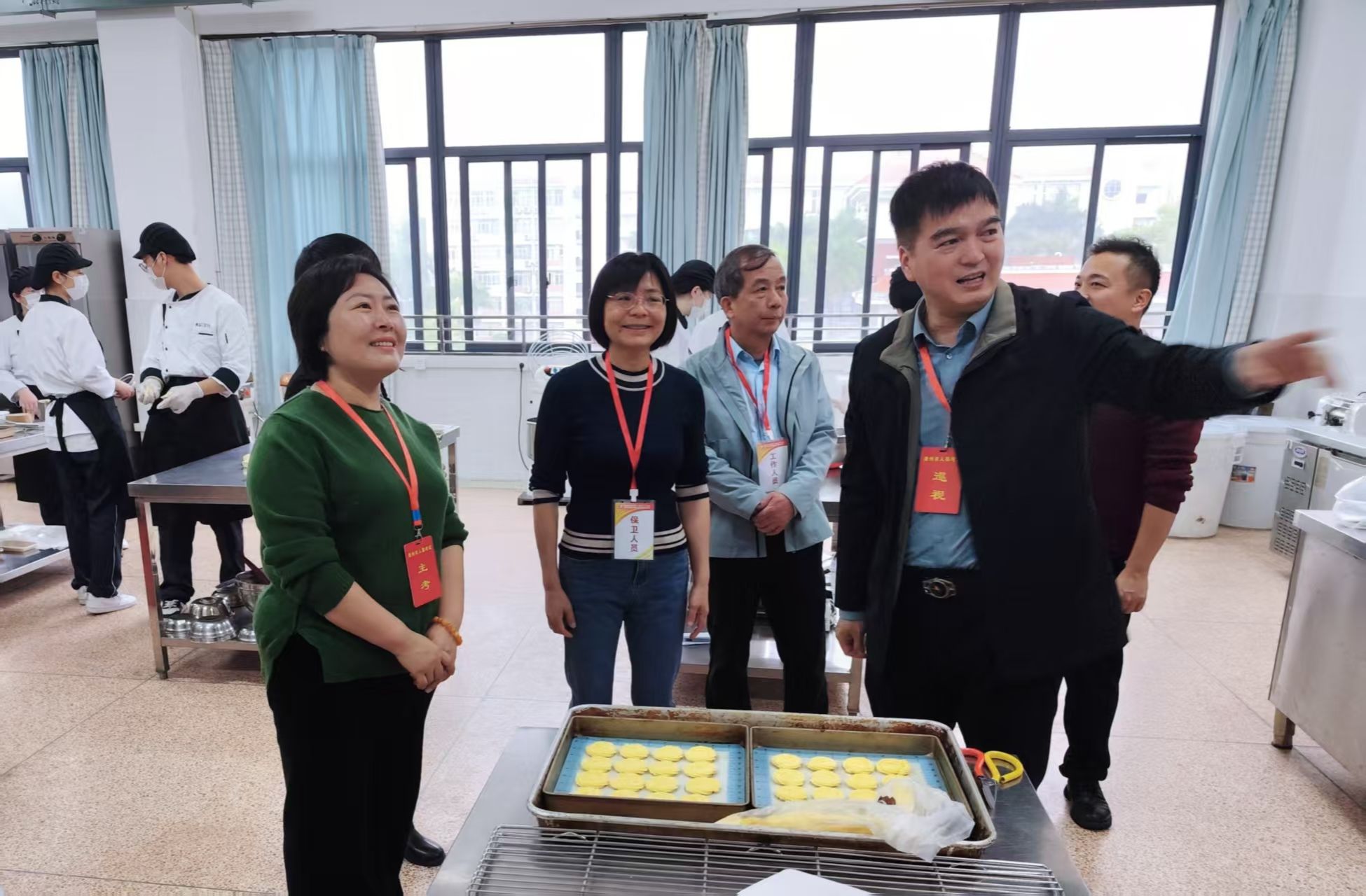 为确保认定工作高效推进,学校培训部与食品产教系紧密协作,成立联合考务组,从考前筹备、过程管理、后勤保障三方面精准发力:培训部制定《考务工作手册》,明确监考、考评、技术支持等岗位职责,确保流程统一、标准明晰;按工种划分理论考场与实操区域,理论考场配备标准化机位及监控系统,实操区还原真实厨房场景,设置独立操作台、原料分拣区及作品展示台,标识清晰、动线合理;全体考生统一穿戴职业工装(西点师戴高帽、围防污围裙,中餐厨师着白色制服、佩戴护袖),工具包内刀具、量具分类收纳,展现职业素养。