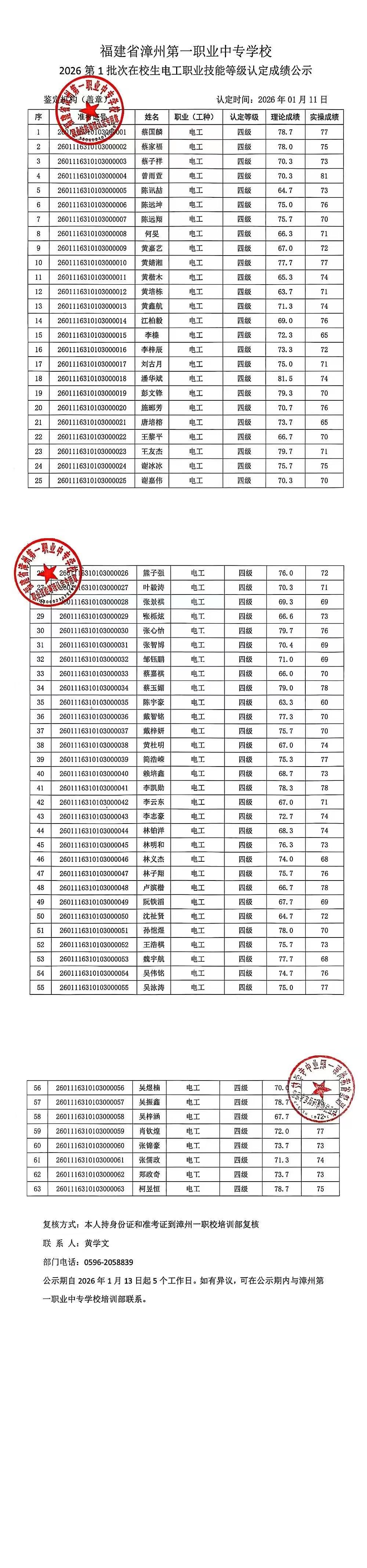 2026年第1批次在校生电工职业技能等级认定成绩公示