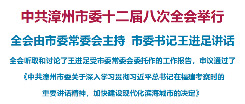 中国共产党漳州市第十二届委员会于2024年12月9日召开第八次全体会议。全会由市委常委会主持,市委书记王进足讲话。全会听取和讨论了王进足受市委常委会委托作的工作报告,审议通过了《中共漳州市委关于深入学习贯彻习近平总书记在福建考察时的重要讲话精神,加快建设现代化滨海城市的决定》。王进足就《决定(讨论稿)》向全会作了说明。