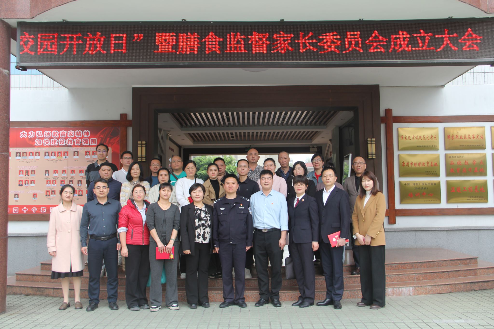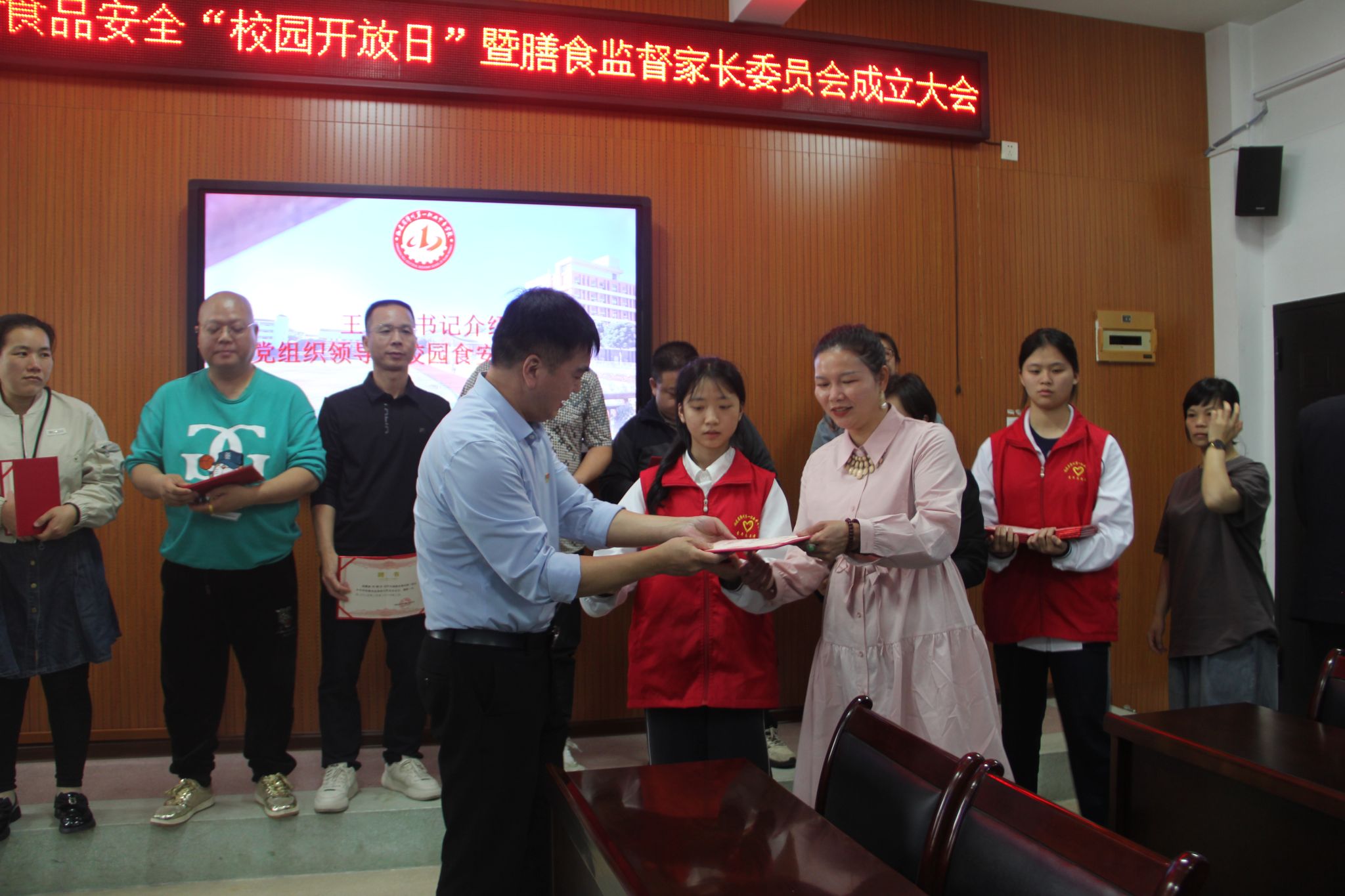 学校党委书记王少全、校长方祝英向膳食监督家长委员会成员颁发聘书,全体来宾合影留念。