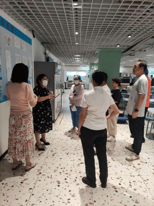 会前,方祝英校长、李燕副校长率领参会人员深入到食堂一线,实地察看食堂卫生区、仓库区、清洗消毒区、操作区等区域,对各关键环节进行了详细的检查。检查过程中,方校长不时地与食堂管理人员进行交流,询问供餐准备情况,并对食品加工留样,食材采购索证索票、台账记录,供应商证件及检测报告,食堂人员健康证、仪容仪表规范等细节提出具体要求。